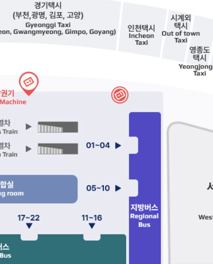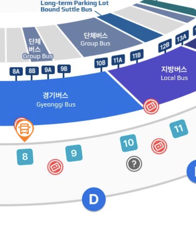 제1터미널과 제2터미널 3층 출국장 앞에 위치한 정류장에 버스아이콘이 표시되어 있어 쉽게 찾을 수 있습니다.