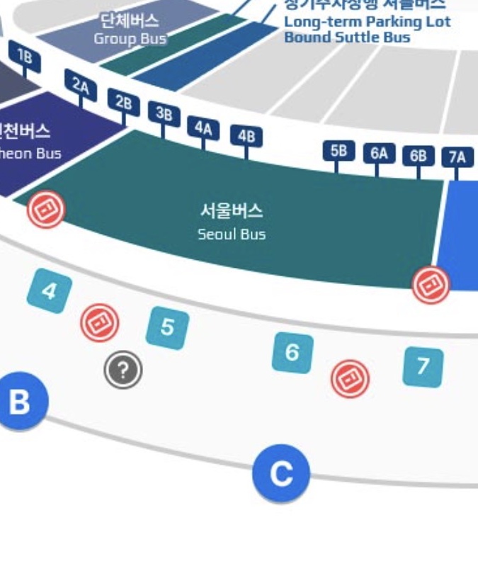 인천공항 제1터미널과 제2터미널 모두 버스 아이콘이 있는 지점에서 탑승이 가능합니다.